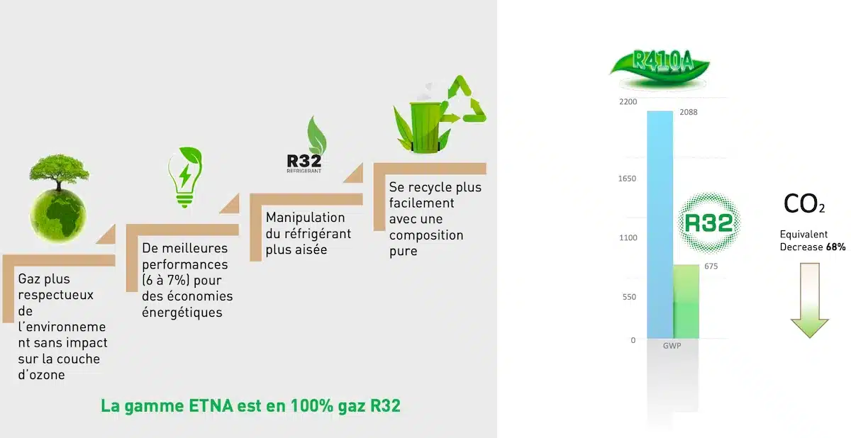 La pompe à chaleur ETNA utilise le gaz R32, un réfrigérant plus respectueux de l’environnement, ne présentant aucun impact sur la couche d’ozone. De plus, ce gaz permet de meilleures performances, avec des économies d’énergie de 6 à 7%, et se recycle plus facilement grâce à sa composition pure.