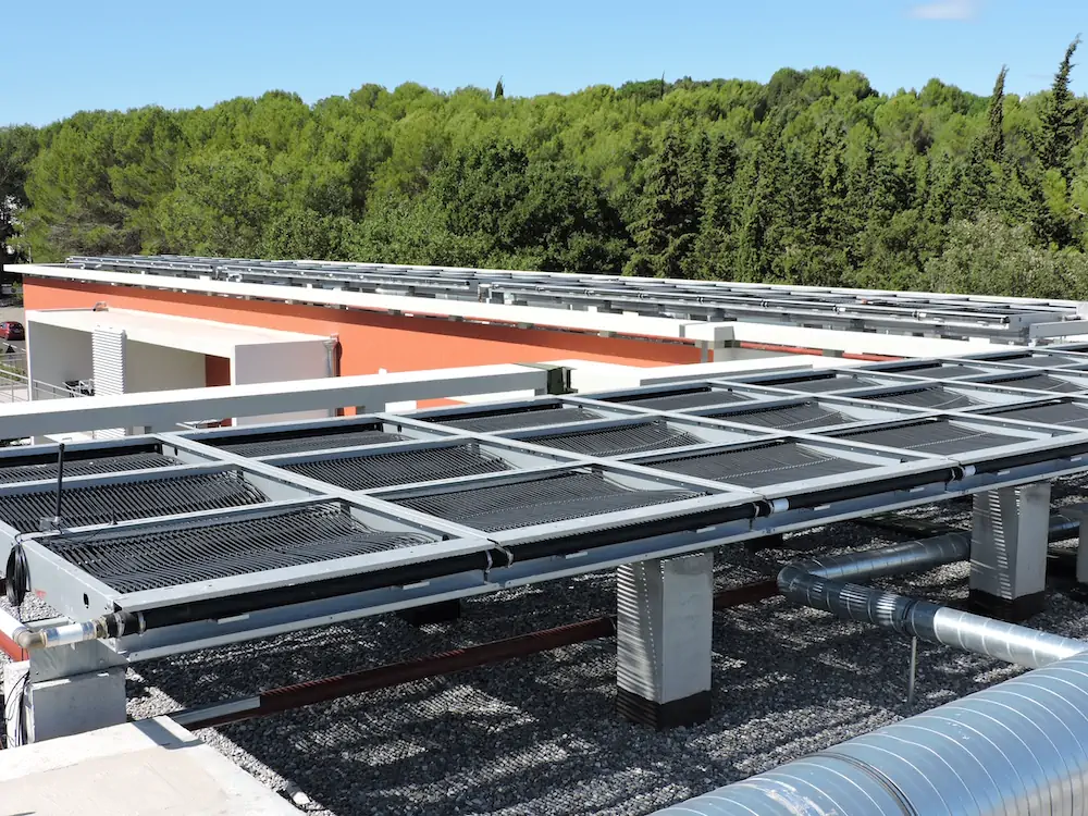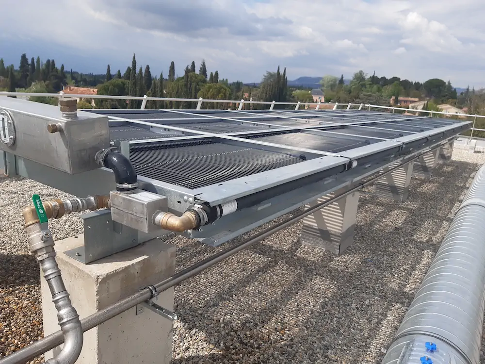 Une nappe de captage solaire atmosphérique capte l’air ambiant 24h/24 et 365 jours par ans quelques soient les conditions de temps et de températures extérieures. L’hiver, elle réchauffe une boucle de fluide qui alimente les pompes à chaleur afin de produire de l’eau chaude sanitaire ou de chauffage.