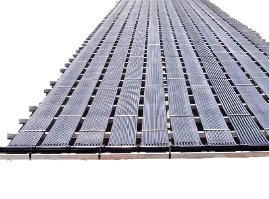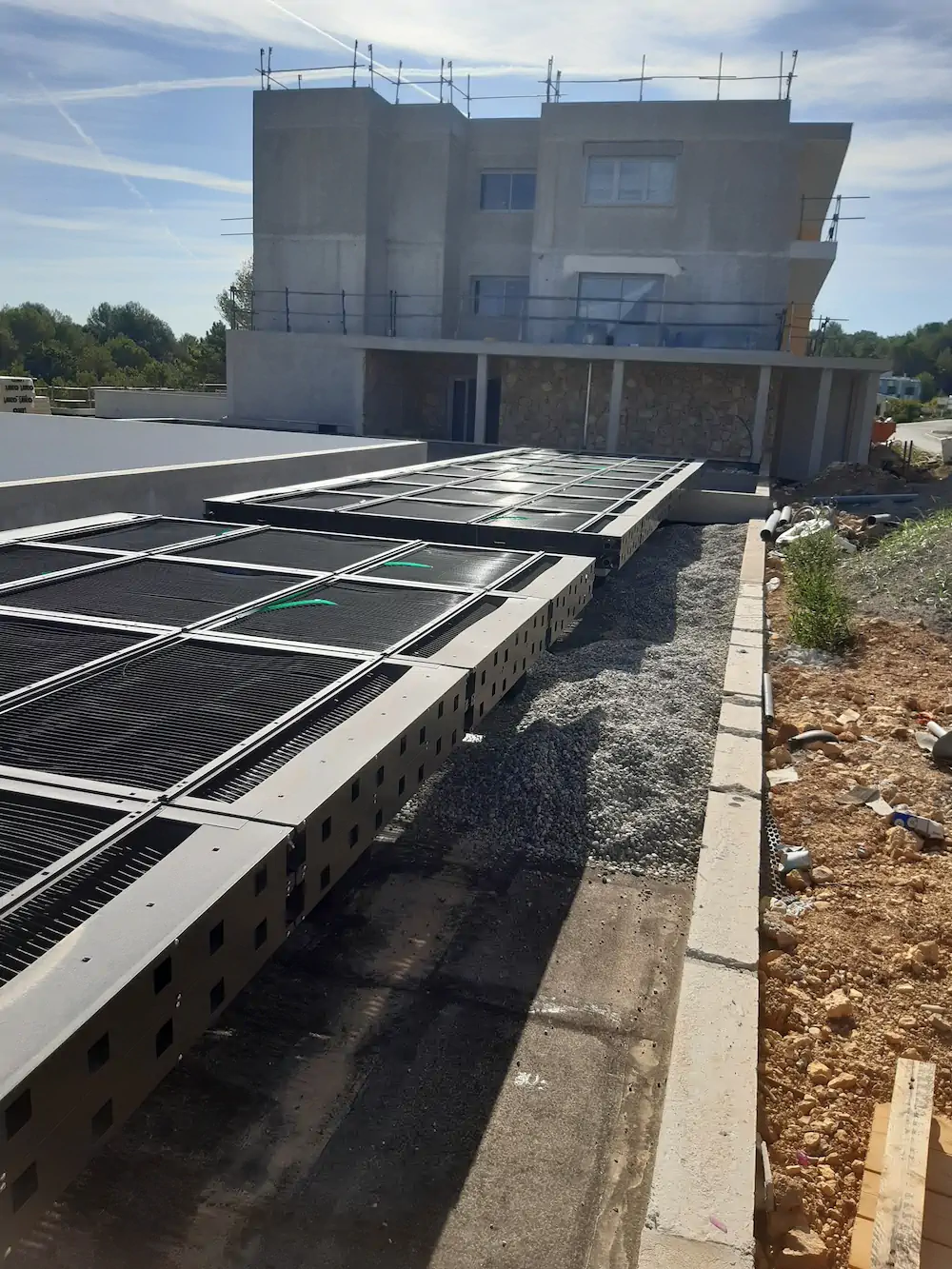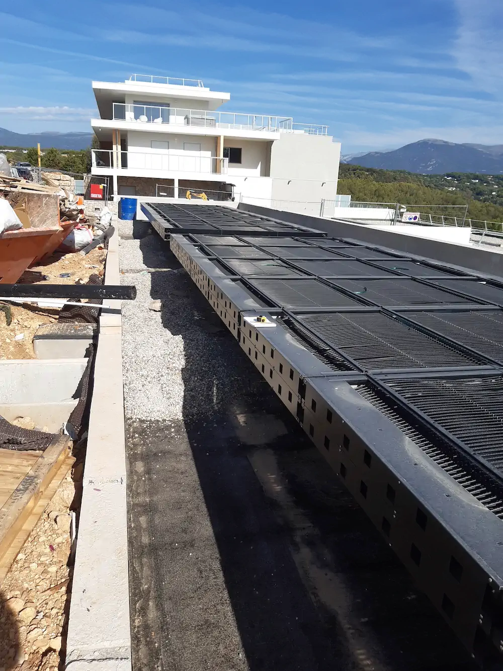 Ces éléments sont reliés entre eux par des pièces de tôlerie L’ensemble est solidaire de lests bétons ou d’ensembles permettant sa fixation au sol ou sur plots. A l’horizontale sur un toit terrasse il ne génère pas de nuisance ni visuelle, ni sonore.